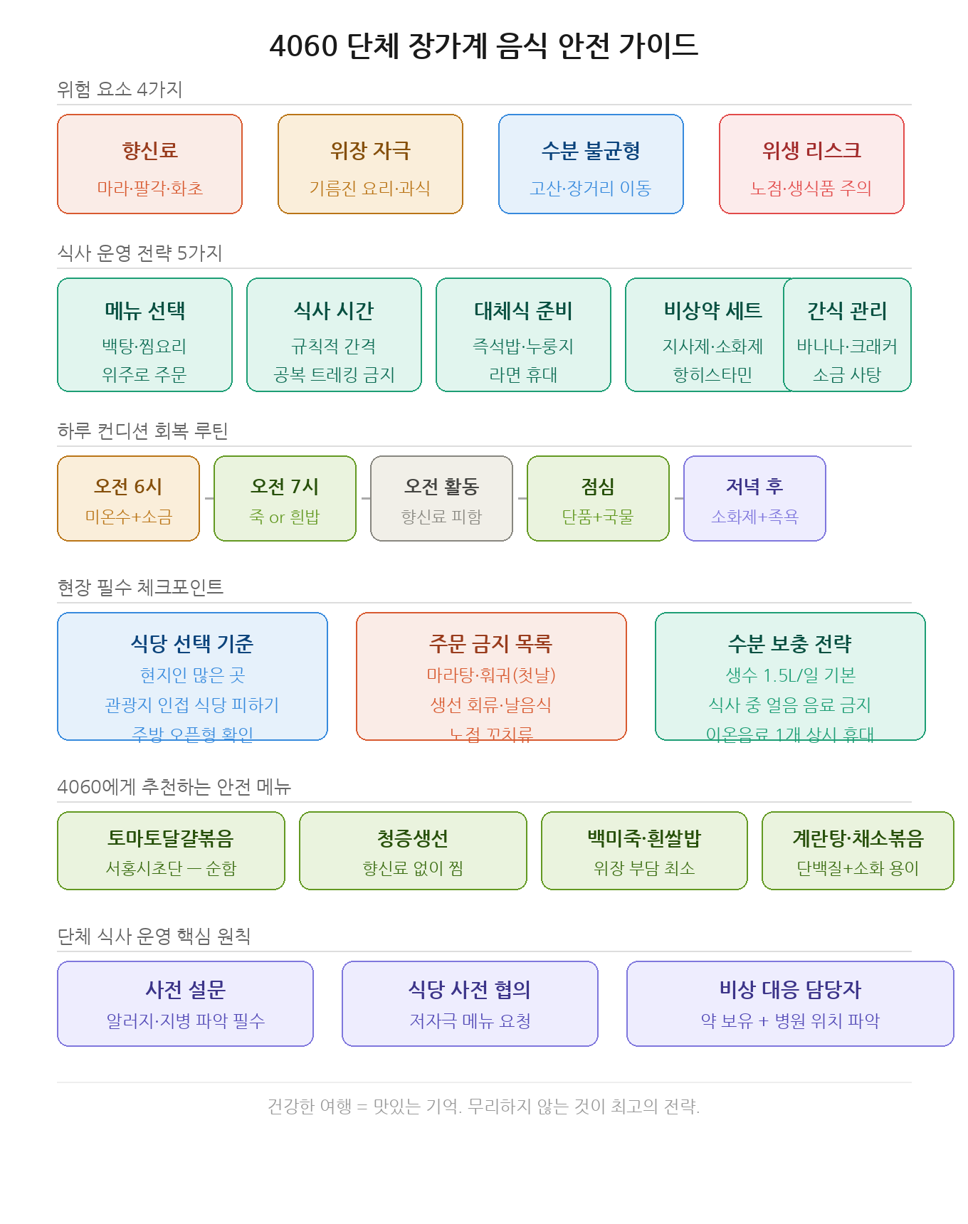 위험 요소 4가지(향신료/위장/수분/위생), 식사 운영 전략 5가지(메뉴 선택/시간/대체식/비상약/간식),